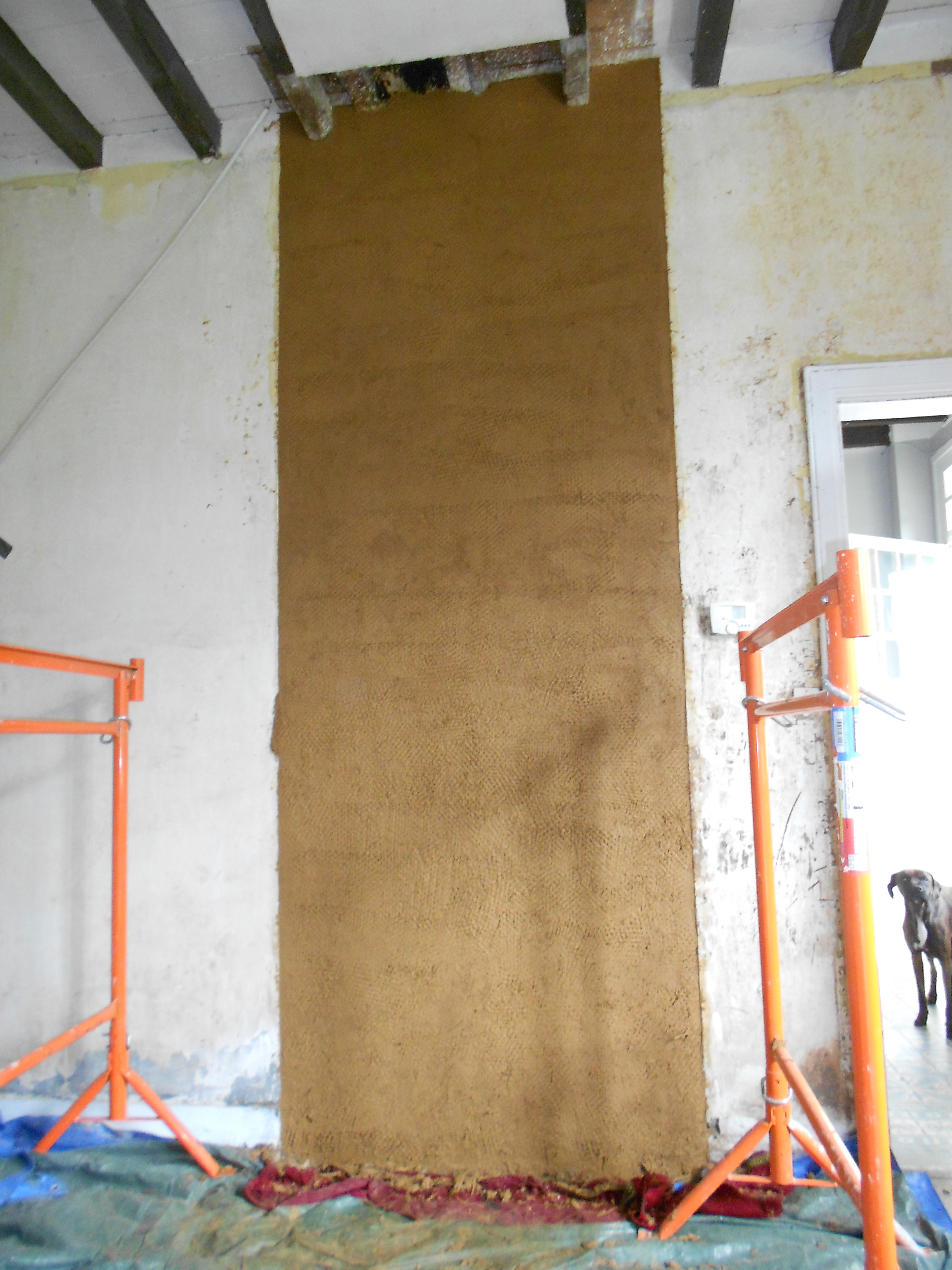 Selon le souhait du client, le torchis reste apparent pour l’instant, mais sa surface a été travaillée pour recevoir un éventuel enduit à la chaux dans le futur.